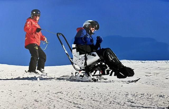 - Pour Nathalie, alternance entre la marche avec orthèses adaptées à des raquettes et dualski piloté en cas de fatigue et de douleurs.